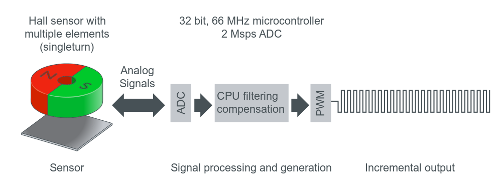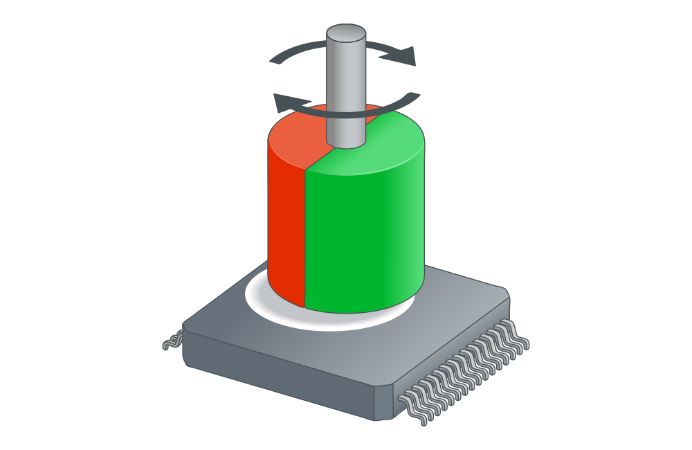 磁性編碼器通過在芯片上旋轉(zhuǎn)磁鐵并測量磁場的變化。這一信息被轉(zhuǎn)換成一系列的脈沖。這是一個簡單、緊湊的設(shè)計,可以承受高強度的沖擊和振動。