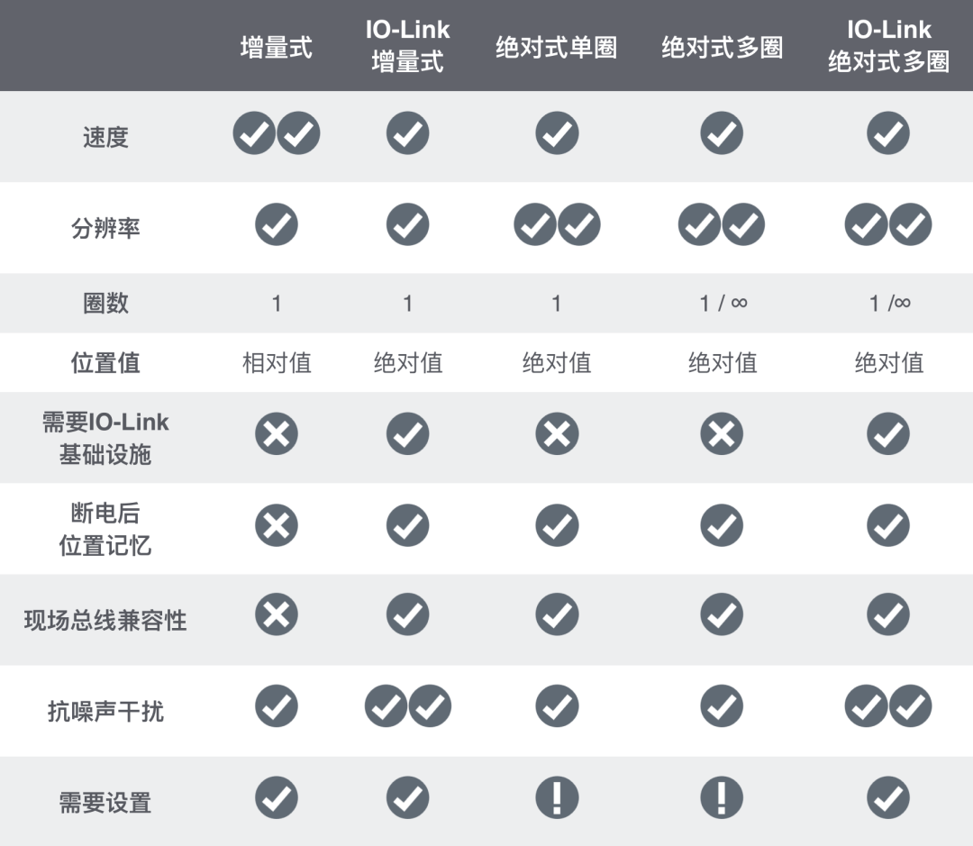 ifm提供各種增量型和絕對性編碼器:實心軸和空心軸配置版本,帶顯示器和不帶顯示器版本,以及帶IO-Link和不帶IO-Link版本。大家可以參考以上表格,根據(jù)現(xiàn)場需求選擇合適的產(chǎn)品。