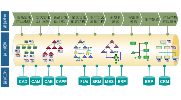 為了實現(xiàn)企業(yè)信息化向數(shù)字化和智能化的轉(zhuǎn)變,集團統(tǒng)籌規(guī)劃了新的IT架構(gòu):在成熟的業(yè)務應用系統(tǒng)之上,依托新建的數(shù)據(jù)主線能力,實現(xiàn)全集團的業(yè)務流程的貫通。從業(yè)務流程角度,圍繞市場需求和產(chǎn)品戰(zhàn)略、需求定義和設計立項、新品開發(fā)和設計復用、功能定義和結(jié)構(gòu)配置、生產(chǎn)工藝和質(zhì)量工程、原型模擬和測試、供應鏈管理、智能制造、產(chǎn)品營銷和售后服務等核心業(yè)務領域,建立全球化、智慧化的戰(zhàn)略經(jīng)營支撐能力。