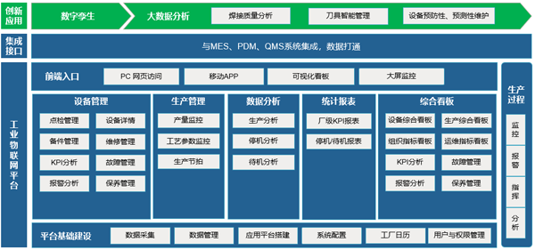 ● 基于大數(shù)據(jù)分析的質(zhì)量控制和工藝優(yōu)化:設備數(shù)據(jù)分析——通過機器學習算法模型建立故障模型,提供故障預警;焊機數(shù)據(jù)分析管理——通過焊接故障控制實驗,對數(shù)據(jù)進行分析,建立焊接機器學習算法模型;刀具數(shù)據(jù)分析——通過刀具故障控制實驗,對數(shù)據(jù)進行分析,建立機器學習算法模型。
