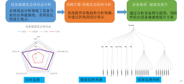 經(jīng)過一年的實施,在工業(yè)互聯(lián)網(wǎng)平臺實現(xiàn)了設備數(shù)據(jù)全量采集和與MES / SCADA系統(tǒng)全面打通的基礎上,目前在設備綜合管理層面交付了設備健康度管理所涉及的設備實時數(shù)據(jù),故障數(shù)據(jù),運行數(shù)據(jù),運維數(shù)據(jù),實現(xiàn)生產(chǎn)設備的總體狀態(tài)分析、預測告警和趨勢分析、以及故障追溯和判斷工具,指導排產(chǎn)、維護和優(yōu)化。