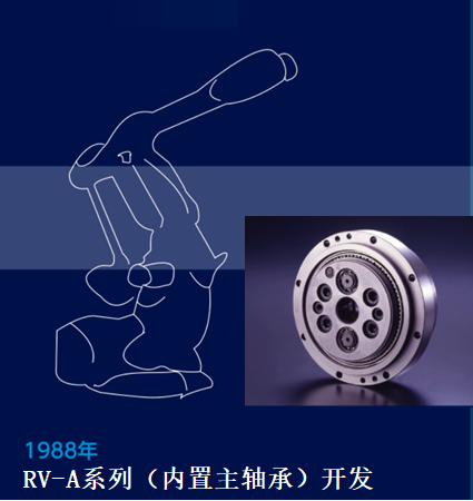 1988年,主軸承內(nèi)置的RV-A系列應(yīng)運(yùn)而生。與初代RV相比,其外形尺寸不變,結(jié)構(gòu)通過主軸承的內(nèi)置化,大大縮短了機(jī)器人的安裝工時(shí),提高了工作效率。
