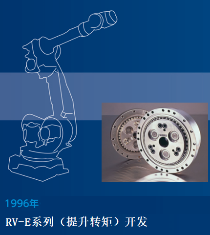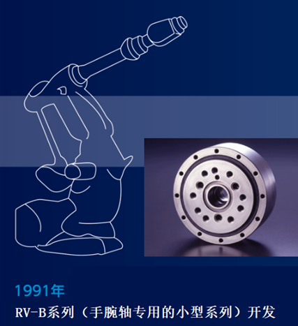 1991年,手腕軸專用的RV-B系列成功開發(fā)。與前代相比,使用了RV-B系列的機(jī)器人擁有更加纖細(xì)的外形,本體重量也更輕,不僅提升了運(yùn)行速度,更是能夠提高其動作的精確度,是機(jī)器人進(jìn)化的重要節(jié)點(diǎn)。