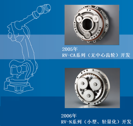 2006年,小型化、輕量化的RV-N系列成功發(fā)行。在維持精密減速機(jī)RV?基本性能的基礎(chǔ)上,將外形進(jìn)一步縮小。進(jìn)一步實(shí)現(xiàn)機(jī)器人的結(jié)構(gòu)緊湊化,解決了對生產(chǎn)線的空間限制和靈活應(yīng)對產(chǎn)線定制化的新需求。