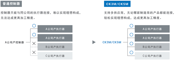 ② CK3M/CK5M系列具有模擬指令、Direct PWM、EtherCAT等豐富的接口,用戶可選擇適合自己應用的執(zhí)行器機構(gòu),從而提升加工精度。