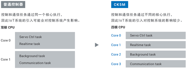 ② CK5M內(nèi)置多核CPU,因此可將控制指令與同上位系統(tǒng)的通信完全分離,消除引入IoT系統(tǒng)對控制系統(tǒng)的影響,減少評估工時。