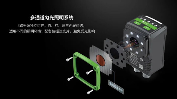 智能讀碼器采用多通道勻光照明系統(tǒng),上、下、左、右4路光源獨立可控,白、紅、藍三色光可選,能根據(jù)現(xiàn)場應(yīng)用環(huán)境,調(diào)整至合適的光源照明,大幅度降低圖像算法分割、識別難度,提高條碼定位精度,讀碼更穩(wěn)定。