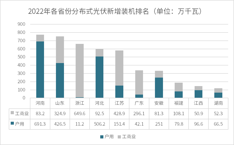 據國家能源局數據統(tǒng)計,2022年全國新增并網容量87.4GW,其中分布式光伏51.1GW,占比約58.5%。山東省分布式光伏新增并網容量7.51GW,約占全國分布式新增容量的14.7%,其中戶用4.27GW,占比約16.9%。