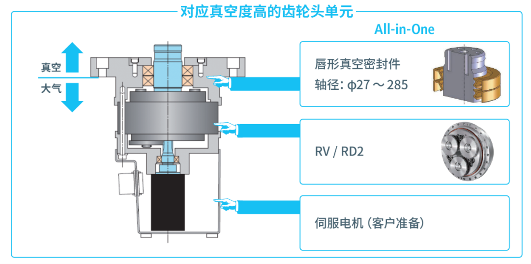 不過,納博特斯克最擅長的就是接受高難度的挑戰(zhàn)。經(jīng)過潛心研究,反復(fù)實(shí)驗(yàn),納博特斯克最終推出了唇形真空密封件與精密減速機(jī)RV?緊湊融合而成的齒輪頭單元——HR系列,滿足了真空晶圓搬送設(shè)備的需求,再一次助力推動(dòng)了半導(dǎo)體行業(yè)的發(fā)展。該系列產(chǎn)品因采用不會(huì)破裂的接觸式唇形密封件,結(jié)構(gòu)緊湊,且安裝、使用方便,可縮短FPD搬運(yùn)用機(jī)器人、晶圓搬運(yùn)裝置的組裝時(shí)間,且有相當(dāng)高的安全性。