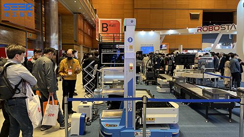 本屆展會仙工智能韓國合作伙伴以打造智能物流完整解決方案主題出展,展區(qū)中包含兩款仙工智能展品,移動機器人 AMB 底盤和激光 SLAM 多層料箱機器人。其中 AMB 底盤上接輥筒結構,無縫對接線邊區(qū)域;料箱機器人通過激光 SLAM 導航,輕松實現柔性對接、精準取放,兩者協(xié)同配合實現高效搬運。
