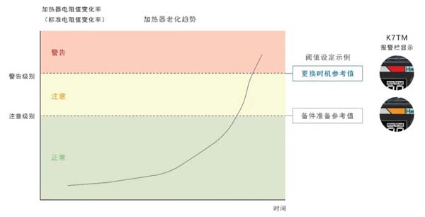 以往沒有測(cè)量加熱器老化趨勢(shì)的手段,只能憑借個(gè)人經(jīng)驗(yàn)或直覺在到達(dá)壽命前進(jìn)行更換,會(huì)造成浪費(fèi)。K7TM則通過監(jiān)控加熱器電阻值變化率捕捉老化趨勢(shì),并依據(jù)加熱器斷線風(fēng)險(xiǎn)增大的變化率狀態(tài)設(shè)定閾值,無(wú)需仰賴個(gè)人經(jīng)驗(yàn),根據(jù)數(shù)據(jù)即可在合適的時(shí)間實(shí)施維護(hù)。