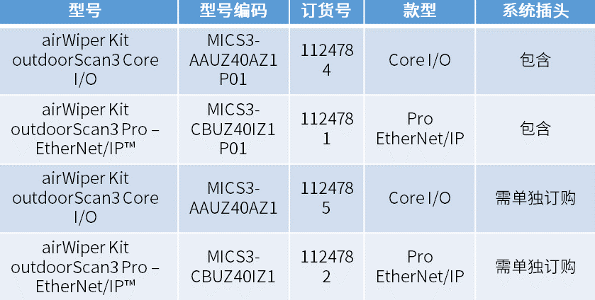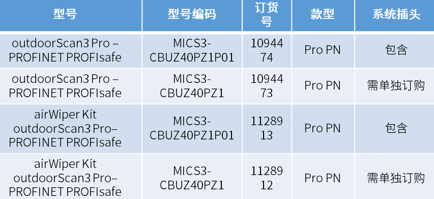 如下表所示,為outdoorScan3 PN類型相關(guān)的訂貨信息,西克可以發(fā)現(xiàn)空氣清潔組件已經(jīng)覆蓋全系列產(chǎn)品。