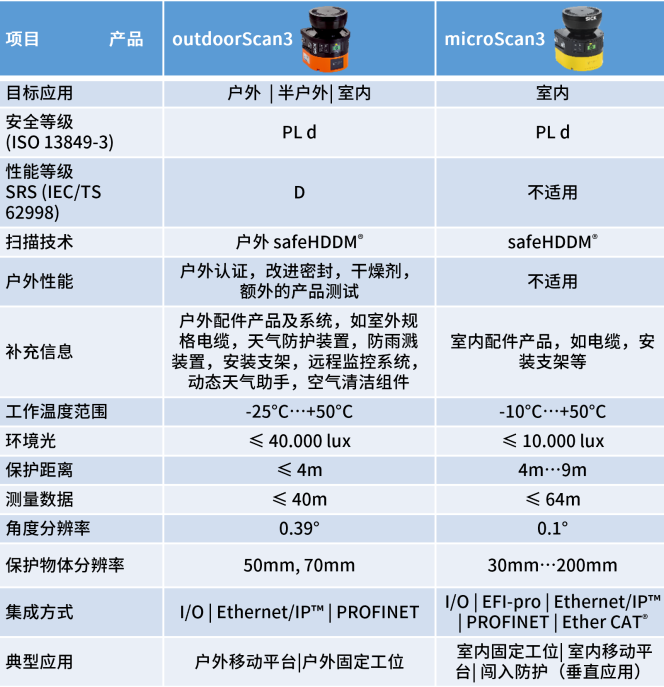 在這里倒是很想分享典型的應(yīng)用于室內(nèi)的microScan3系列與outdoorScan3系列的主要差異,以便大家在評估應(yīng)用時有所參考。具體如下表: