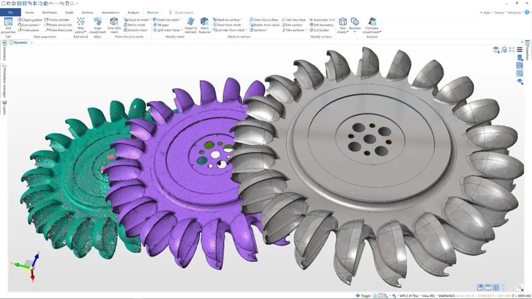 絕對(duì)臂獲取的點(diǎn)云數(shù)據(jù),可通過REcreate軟件實(shí)現(xiàn)逆向處理和CAD建模,從而完成水輪機(jī)設(shè)計(jì)的改進(jìn)和優(yōu)化。REcreate 逆向工程處理軟件,專為CAM用戶實(shí)現(xiàn)簡單高效的CAD建開發(fā),能最大程度降低操作的復(fù)雜性,用戶再也無需在掃描和逆向軟件中來回切換。