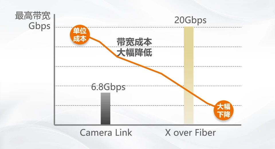高速線陣相機(jī)方案采用光纖作為通訊介質(zhì),抗干擾能力強(qiáng),傳輸距離遠(yuǎn)。與Camera Link接口方案相比,該方案單G成本性價比優(yōu)越。