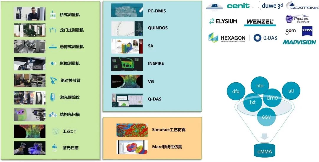 eMMA支持各類3D尺寸數(shù)據(jù)的自動采集和結(jié)構(gòu)化解析,支持固定式測量系統(tǒng)、復(fù)合式影像測量系統(tǒng)、便攜式測量系統(tǒng)等設(shè)備輸出的3D尺寸數(shù)據(jù)。