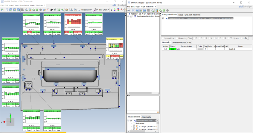 eMMA為鈑金件、內(nèi)外飾等產(chǎn)品的塑型、成型過程提供質(zhì)量保證;為客戶及其供應(yīng)商提供企業(yè)級的數(shù)據(jù)管理方案,保證數(shù)據(jù)安全;具備PLM系統(tǒng)接口,便于快速、準(zhǔn)確獲取產(chǎn)品裝配結(jié)構(gòu)和CAD模型;采用BOM結(jié)構(gòu)化數(shù)據(jù)管理方式,通過eMMA Client從相應(yīng)產(chǎn)品通道快讀提取數(shù)據(jù);作為中立系統(tǒng),既具備收集三坐標(biāo)測量數(shù)據(jù)并進(jìn)行多個零件間虛擬匹配分析的功能,又對光學(xué)點云數(shù)據(jù)、在線測量數(shù)據(jù)提供專業(yè)的數(shù)據(jù)分析方案。