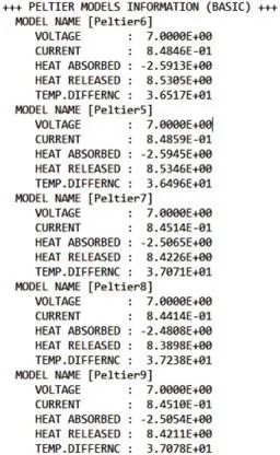 CFD軟件有助于更好地理解這些現(xiàn)象。這種類型的分析使得估算激光器組件之間的溫度分布(圖3) 、溫度場(圖4)和冷卻空氣的速度(圖5)成為可能。它還確定了Peltier元件的熱電參數(shù)(熱端和冷端溫度、電流率、壓力、散熱) (圖6) 以及確保Peltier元件穩(wěn)定運行的最大允許環(huán)境溫度。