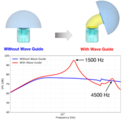 聲波導管可以保護喇叭不受環(huán)境中水汽的影響,而且在聲音調校方面起到重要作用。工程師使用Actran管道聲場仿真技術進行導管的設計以加強中頻1500Hz聲音傳播。同時喇叭內部覆蓋件和驅動單元之間的空間得到優(yōu)化,以加強4400Hz附近的聲壓級。