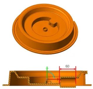 產(chǎn)品形狀簡(jiǎn)單,有一個(gè)倒扣結(jié)構(gòu),倒扣行程為60mm,采用滑塊抽芯。因?yàn)榛瑝K行程太大,從整幅模具的成本考慮,采用普通的滑塊抽芯,會(huì)使模架做的很大,斜導(dǎo)柱長(zhǎng)度會(huì)很長(zhǎng),從而導(dǎo)致模具成本大幅度增加,模具穩(wěn)定性有影響,綜合考慮,這里采用油缸抽芯。