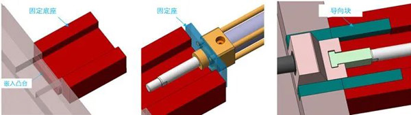 設(shè)計(jì)底座時(shí)需要考慮底座的定位,這里采用底座嵌入到模架上,更加的穩(wěn)定。這里導(dǎo)向塊太長(zhǎng),就將它在每邊截成了兩段,分別固定。效果如圖所示。