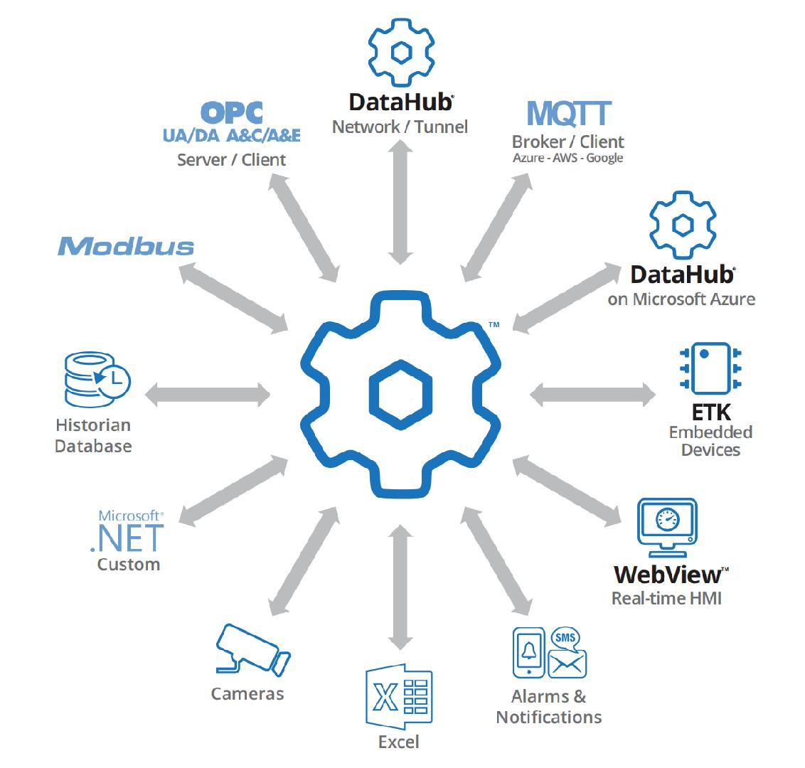 DataHub實現(xiàn)將來自所有來源和任何協(xié)議的所有數(shù)據(jù)整合到DataHub程序中的單個統(tǒng)一數(shù)據(jù)集中。任何客戶端都可以使用任何受支持的協(xié)議訪問聚合數(shù)據(jù)的任何選定子集,例如:OPC UA、OPC Classic、Modbus、MQTT、DDE、TCP、ODBC、HTTP、XML 等;支持連接任何SQL數(shù)據(jù)庫、自定義程序、嵌入式系統(tǒng)、Microsoft Azure IoT Hub、Google IoT、AWS IoT Core、任何標準MQTT客戶端或代理以及流行的實時數(shù)據(jù)歷史記錄;其他功能包括支持連接到Excel電子表格和其他DDE服務器;支持電子郵件/ SMS通知;支持在相同數(shù)據(jù)源之間進行熱備用切換的數(shù)據(jù)冗余,以及相機流式傳輸系統(tǒng)的實時視頻或圖像。