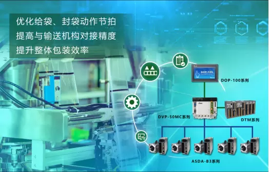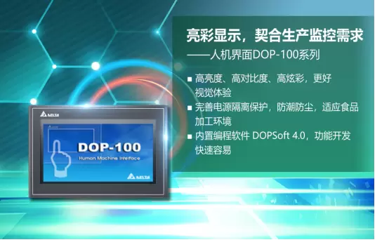 通過人機界面DOP-100系列實時查看生產(chǎn)進度,調(diào)整控制指令,幫助管理者實時監(jiān)測產(chǎn)線上的狀況,使包裝作業(yè)流程更加流暢、高效、精準。