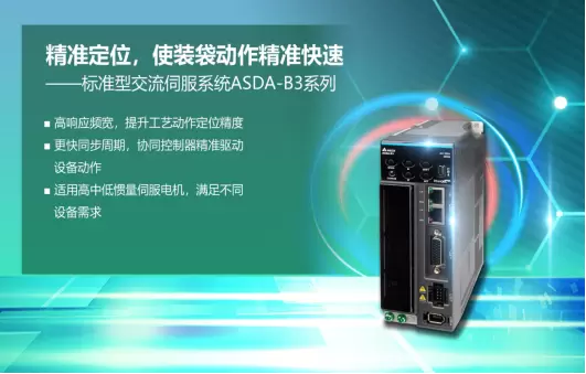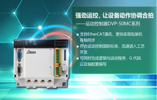 以EtherCAT總線型多軸運動控制器DVP-50MC系列作為主控,控制標準型交流伺服系統(tǒng)ASDA-B3系列,驅(qū)動五臺臺達交流伺服電機,執(zhí)行旋轉(zhuǎn)、上袋、伸縮、抱袋、輥袋等動作。