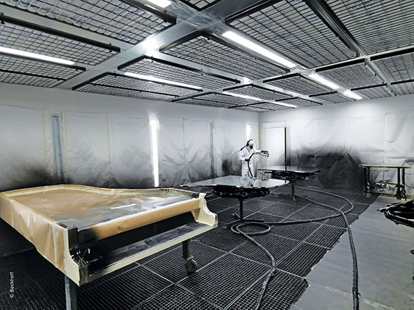 聚酯漆對(duì)施工工藝的要求非常高,若想達(dá)到最佳效果,室溫必須恒定在 25 °C(±0.5 °C),濕度保持在 45-50%。此外,必須以定義的速度排放噴漆作業(yè)區(qū)的廢氣,以防止漆霧顆粒隨后沉積在已噴好漆的表面?!柏惿浞蛉卿撉俦砻娼?jīng)過 8 道聚酯噴涂,確保表面始終光亮如新:油漆越黑,散射的光線就越少,外形也越精致美觀?!必惿浞蚬炯夹g(shù)和制造總監(jiān) Thomas Broukal 強(qiáng)調(diào)道。在決定建造新車間時(shí),貝森朵夫最注重的是在環(huán)保和降低能耗方面樹立新的標(biāo)桿?!斑@是我們公司歷史上規(guī)模最大的一筆投資,但它將能耗降低了 75%,車間很快就能收回成本。”Thomas Broukal 說道。