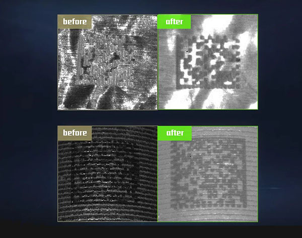 安裝勻光罩之后,背景抑制非常明顯,DPM碼的特征成像更清晰,從而實(shí)現(xiàn)對(duì)復(fù)雜環(huán)境和疑難碼的更高讀取率。