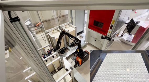 * 機(jī)器人的雙抓手縮短了紙板加工的周期時(shí)間——協(xié)作型機(jī)器人拿出激光打孔后的紙板,旋轉(zhuǎn) 180° 后,立刻插入下一張尚未打孔的紙板。