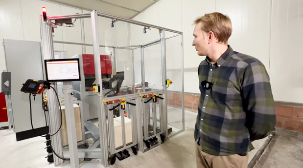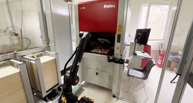 位于系統(tǒng)中心的是 Trotec Laser Gmbh 的激光單元,它承擔(dān)著打孔的任務(wù),而且尺寸可以靈活準(zhǔn)確地定制。系統(tǒng)的框架和護(hù)罩則使用 item 的型材技術(shù)。激光單元的正前方是卡索機(jī)器人公司(Kassow Robots)的七軸協(xié)作型機(jī)器人。紙板的供應(yīng)則通過 item 型材技術(shù)搭建的三輛推車來完成,這些推車通過入口從外部接觸工作站。此外,還有一輛空推車在一旁隨時(shí)待命。整個(gè)生產(chǎn)過程從一輛裝滿紙板的推車開始。首先,機(jī)器人從推車中拿出未加工的紙板,然后放到激光單元的下方?!巴ㄟ^施邁茨公司(Schmalz)提供的雙抓手,機(jī)器人先拿起剛加工過的紙板,旋轉(zhuǎn) 180° 后,再放下尚未打孔的紙板。” Becker 解釋說。