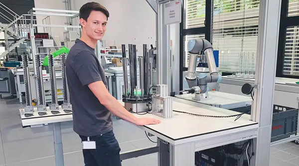 在此之前,所有的滾輪零部件都在小部件裝配區(qū)拆開包裝,并放置在不同的料盒中,然后放入氣動裝配設備中進行組裝?,F(xiàn)在,這些工作大多數(shù)由協(xié)作型機器人完成。員工只需在一開始將工件放在幾個周轉(zhuǎn)箱中即可。協(xié)作型機器人會拾取必要的單個零件并插入裝配設備中。完成自動裝配后,機器人會對成品進行分類并放入對應的工件托架。因此,我們可以實現(xiàn)三種不同類型滾輪的半自動化生產(chǎn)。在這個過程中,偶爾才需要人機協(xié)作,因為機器人完成了近 90% 的工作。當裝配設備插入零件并啟動后,也就開始了自動化生產(chǎn)過程,這意味著員工只需要完成 10% 的裝配工作。這樣做的好處是,當協(xié)作型機器人處理這些工作時,員工可以專注于有更高價值創(chuàng)造潛力的生產(chǎn)活動。