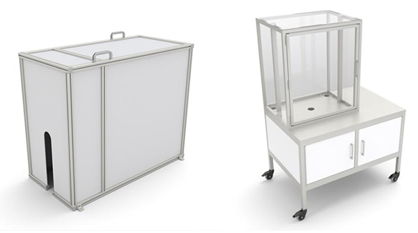 * 5 系列鋁型材可用來搭建實(shí)驗(yàn)室工作臺護(hù)罩 (左上,工作臺由 8 系列型材搭建而成) 或控制裝置測試站 (右)。