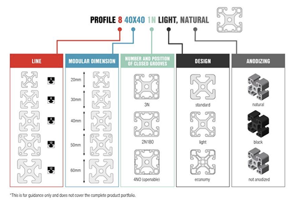 需要特別注意的是,并非所有的鋁型材都有上述三種設(shè)計(jì)規(guī)格。事實(shí)上,在 item 在線目錄中,所有的鋁型材都以一定的方式進(jìn)行描述,比如:型材 8 系列 40x40 1N 輕型, 氧化銀白。這些描述的含義如圖所示: