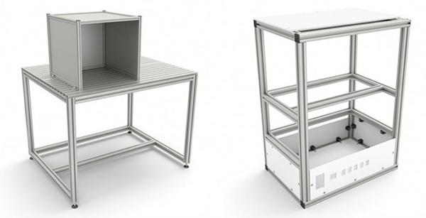* 6 系列:這種鋁型材可用來創(chuàng)建電機(jī)護(hù)罩 (左) 或?qū)嶒?yàn)室推車 (右)。
