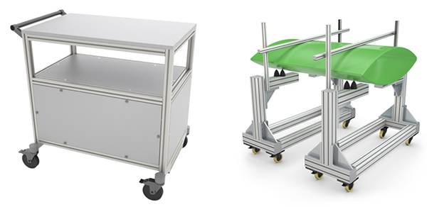 * 這種堅(jiān)固的車間推車 (左) 和重型工件托架 (右) 就是采用 8 系列型材搭建而成。