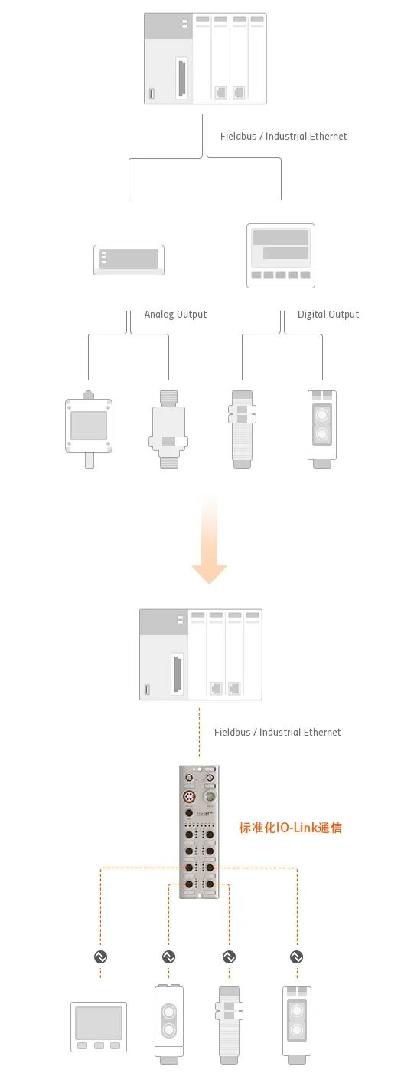 IO-Link設(shè)備的輸出信號(hào)可以通過IO-Link主站進(jìn)行標(biāo)準(zhǔn)化,而無(wú)需針對(duì)每種類型的信號(hào)使用特定的控制器。