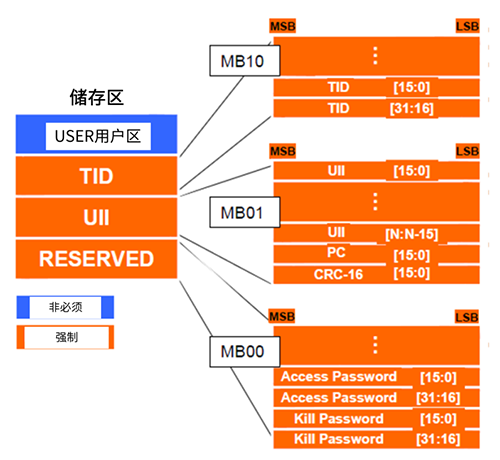 首先,我們從標(biāo)簽的儲存方式了解下。這次推文我們先著重看下超高頻部分,目前常見的標(biāo)準(zhǔn)UHF應(yīng)用中經(jīng)常提到的6C標(biāo)簽儲存區(qū)劃分邏輯圖為: