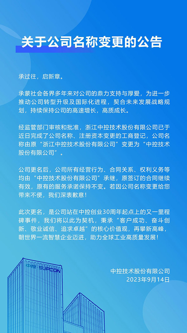 關(guān)于“公告 | 正式更名!中控技術(shù)股份有限公司”,填寫反饋