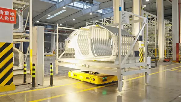 內飾線、完成線采用全新定制的重載AMR替代傳統(tǒng)的滑板線,重載AMR可將車體舉升和運送,同時設置物流同步搬運裝置,實現(xiàn)打包物料同步;潛伏AMR、牽引AMR自動配送所需物料到產(chǎn)線,在滿足滑板線基本功能的基礎上,達到生產(chǎn)線柔性部署、節(jié)拍調整靈活的效果。