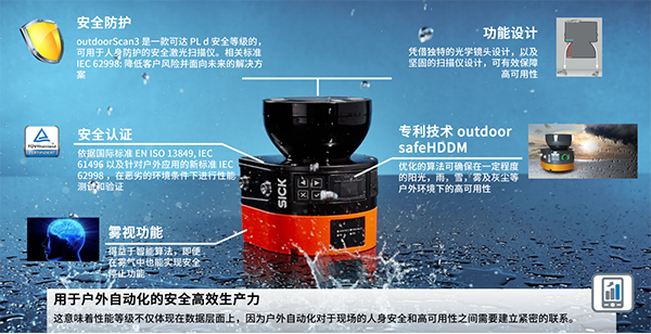 ● 這里,SICK的重磅產(chǎn)品-outdoorScan3就閃亮登場(chǎng)了:作為2D安全激光掃描儀,憑借PL d安全等級(jí),在該戶外重載AGV的全方位的過(guò)程安全中起到了關(guān)鍵作用: