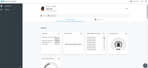 借助SICK Monitoring Box,您能非常方便的通過(guò)終端(例如電腦、手機(jī)等)訪問(wèn)當(dāng)前運(yùn)行的設(shè)備信息,例如outdoorScan3當(dāng)前的設(shè)備狀態(tài),診斷信息,數(shù)據(jù)統(tǒng)計(jì)以及預(yù)維護(hù)提示等等;方便我們對(duì)現(xiàn)場(chǎng)設(shè)備的了解以及管理。