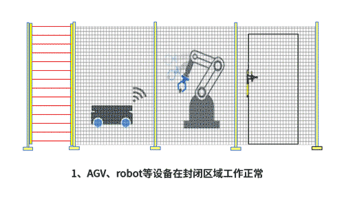 因此,AGV/AMR制造商或集成商需針對這類無人倉儲區(qū)搭建一個具備安全網(wǎng)絡(luò)的系統(tǒng),確保AGV/AMR、以及其他危險設(shè)備能夠?qū)ν饨鐒幼髯龀龇磻?yīng),如當有人按下急停按鈕、觸發(fā)光幕,或者打開安全門時,危險區(qū)域內(nèi)的所有危險動作都必須安全停止。當操作或維護人員處理完問題離開封閉區(qū)域,并確認運行區(qū)域安全后,AGV/AMR等設(shè)備收到信號,繼續(xù)恢復(fù)工作。