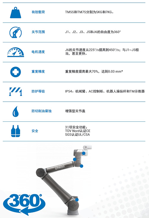 歐姆龍協(xié)作機(jī)器人TM S系列豐富的有效載荷和工作半徑組合,加上高精度、高分辨率相機(jī)和先進(jìn)的安全功能,使歐姆龍S系列協(xié)作機(jī)器人成為各類(lèi)應(yīng)用的理想選擇。