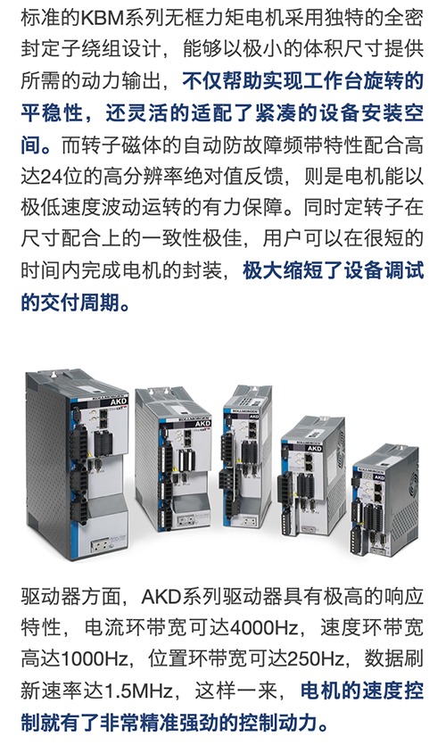 ● 1臺(tái)4kW/24A KBM無(wú)框力矩電機(jī),用于滾動(dòng)軸的旋轉(zhuǎn)驅(qū)動(dòng)