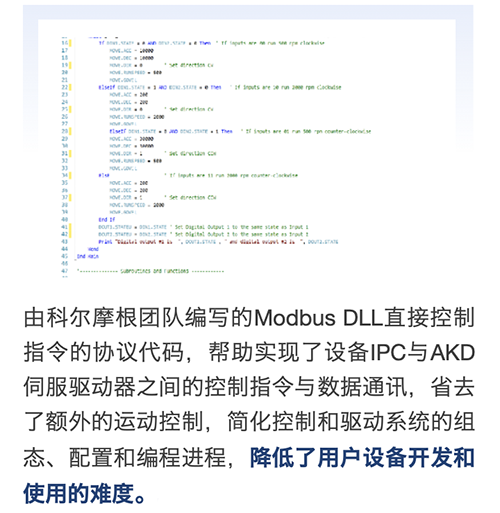 ● AKD伺服驅(qū)動(dòng)器通過(guò) Modbus 與上位IPC控制器通訊,接收速度控制指令,為此科爾摩根還為用戶編寫了Modbus DLL直接控制指令的協(xié)議代碼。