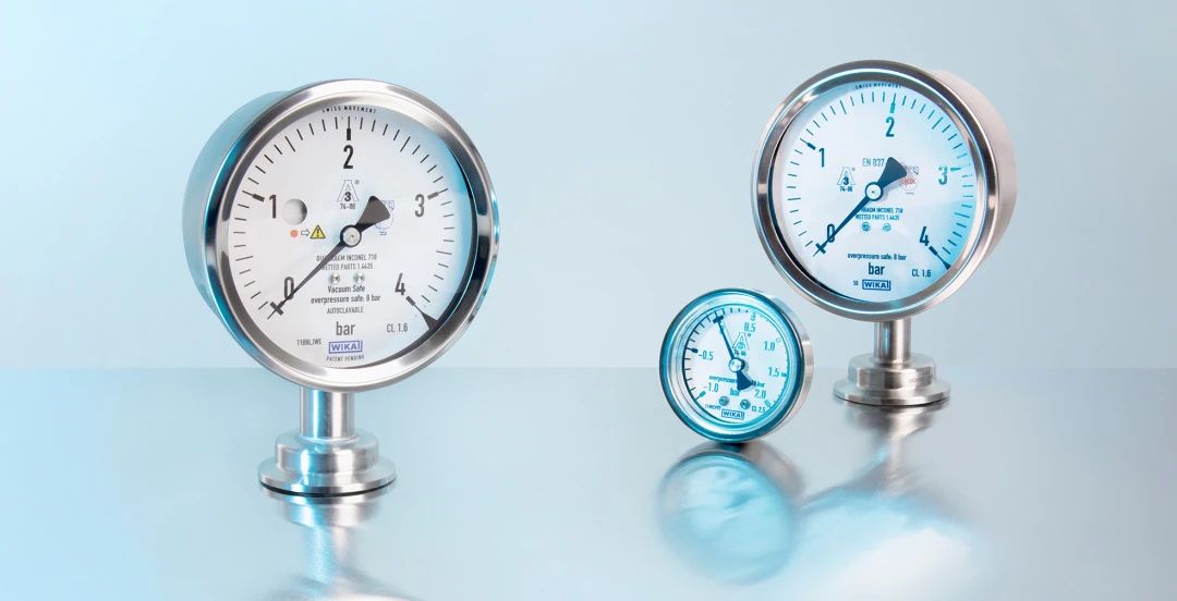 威卡PG43SA系列的兩款膜片式壓力表非常適用于這個場景。除了高安全過載以外,該系列的膜片式壓力表具有“干式測量系統(tǒng)”的優(yōu)點,由于隔膜密封腔體內沒有任何的填充液,因此不會對介質產生污染的風險。此外,PG43SA具有衛(wèi)生型設計,膜片是齊平式焊接,適用于CIP/SIP清洗過程,也能夠對整個壓力表進行高壓滅菌。