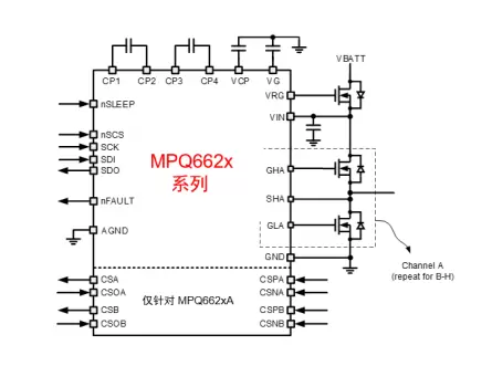 在車身控制方面,MPS的8路PWM汽車級(jí)驅(qū)動(dòng)MPQ662x系列產(chǎn)品,具有6V-40V 輸入電壓和64mA 柵極驅(qū)動(dòng)電流,可以同時(shí)驅(qū)動(dòng)4個(gè)有刷電機(jī),集成性非常強(qiáng)。另外,它還提供SPI串聯(lián)控制接口,其 Charge pump 可用于實(shí)現(xiàn)外部 N-MOS 防反電池保護(hù)和實(shí)現(xiàn)高端柵極驅(qū)動(dòng)支持 100% 占空比 ,而8路PWM可以極大簡(jiǎn)化用戶的設(shè)計(jì)。