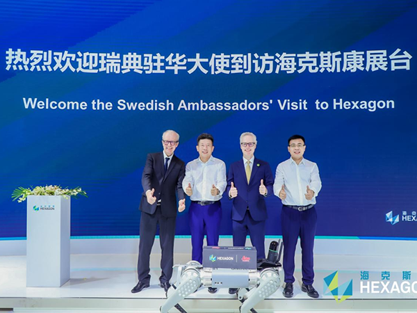 瑞典駐華大使到訪海克斯康展臺(tái),海克斯康集團(tuán)全球副總裁及??怂箍荡笾腥A區(qū)總裁李洪全、??怂箍抵圃熘悄艽笾腥A區(qū)執(zhí)行總裁郝健熱情接待。